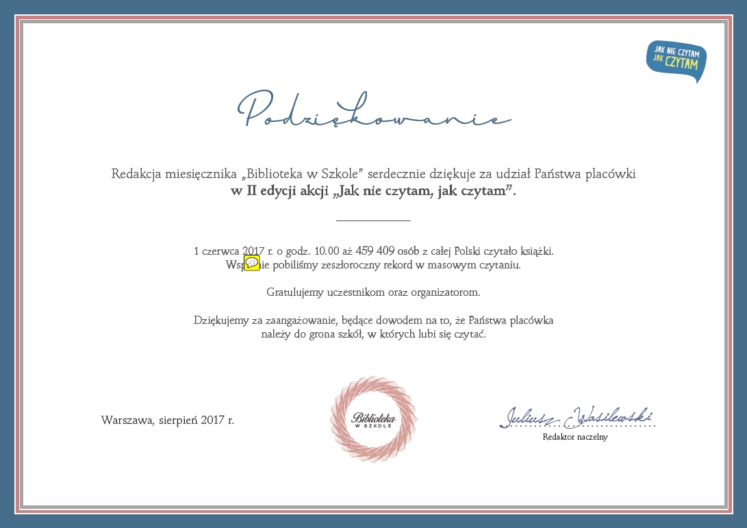 Z przyjemnością informujemy, że rekord w ogólnopolskim czytaniu w ramach akcji „Jak nie czytam, jak czytam” został pobity.