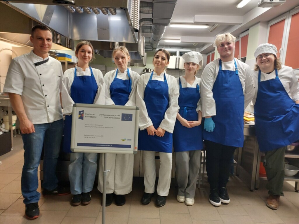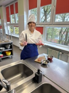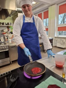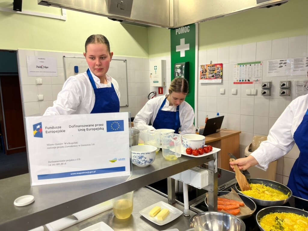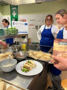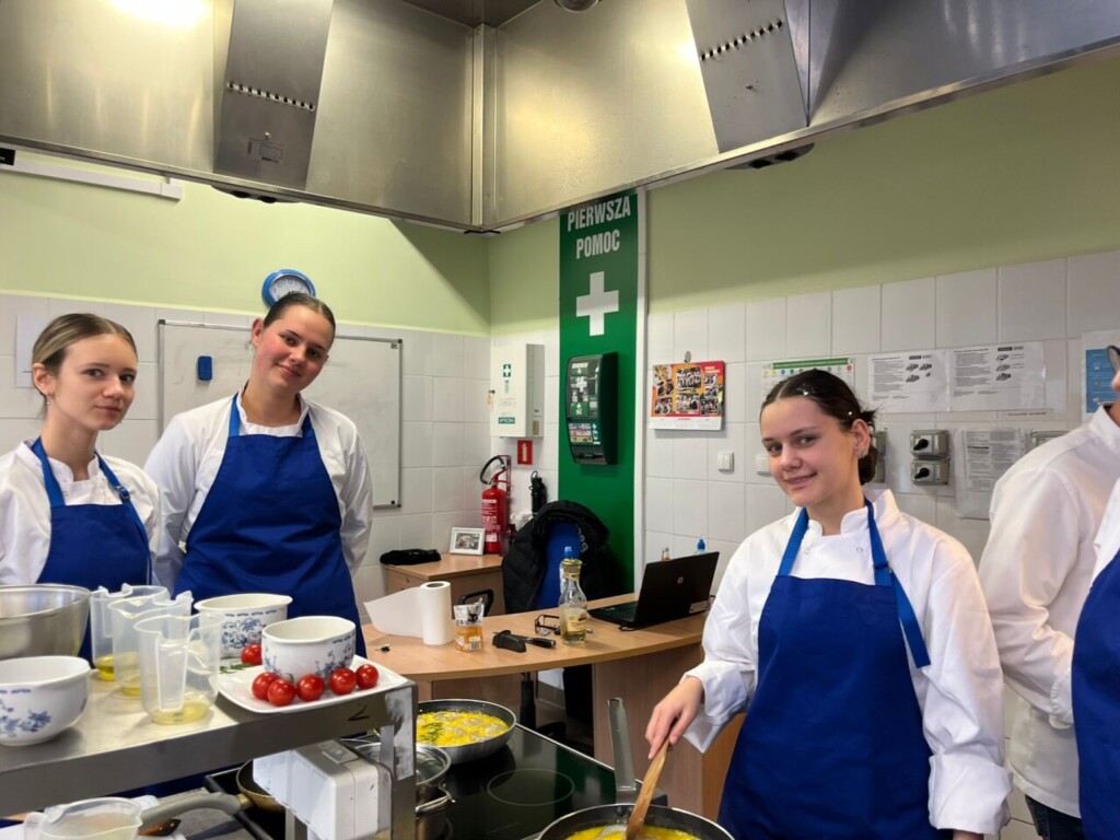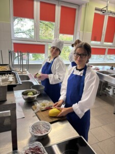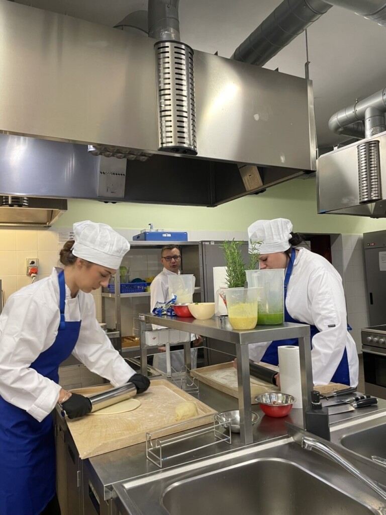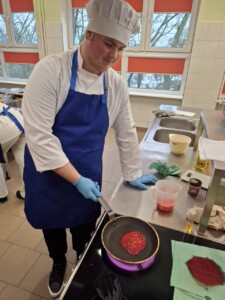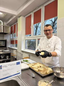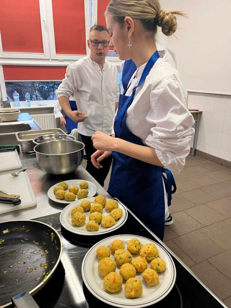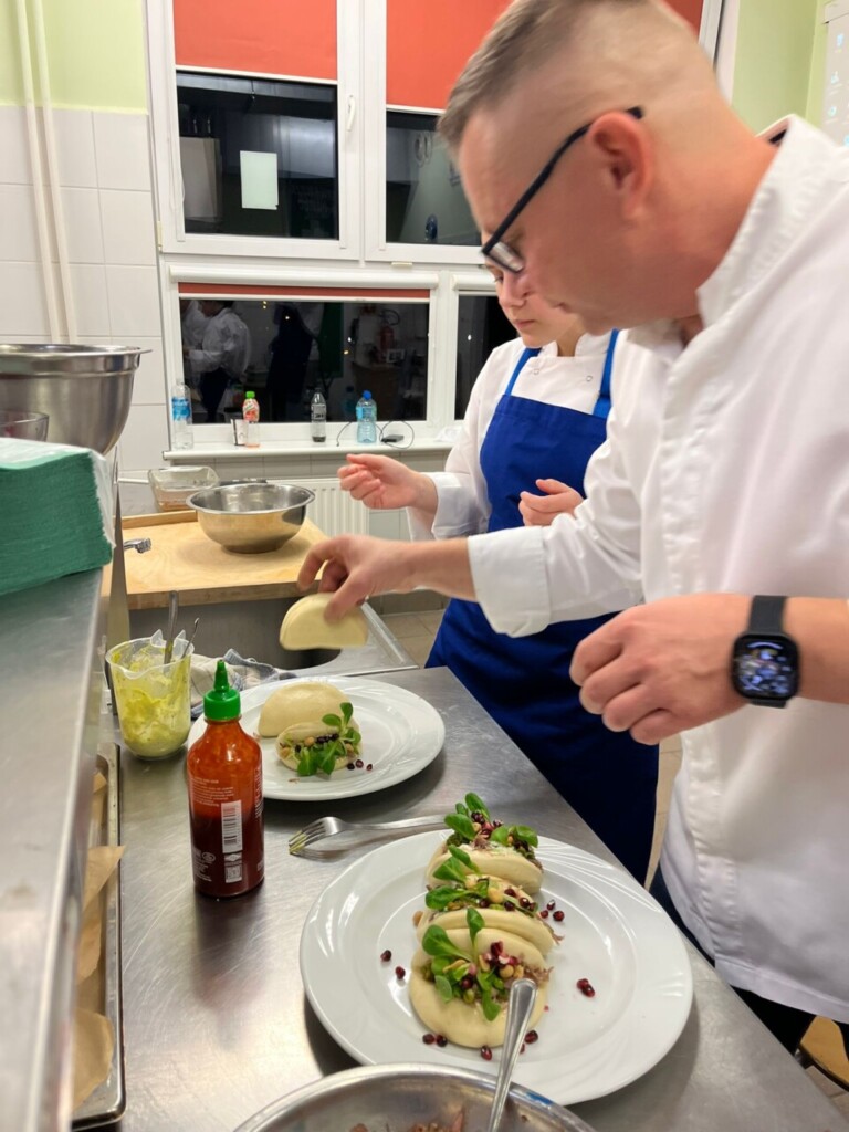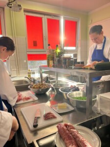 Podczas warsztatów kulinarnych uczestnicy zakwalifikowani do udziału w spotkaniach prowadzonych przez pana Michała Rejniaka – szefa kuchni i nauczyciela przedmiotów zawodowych, zmierzyli się z wymagającą tematyką pod hasłem „Kuchnie różnych narodów”.
