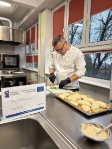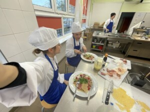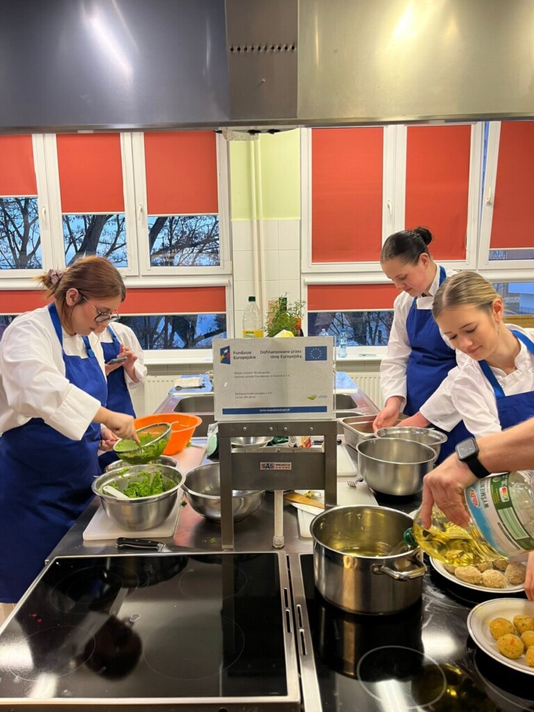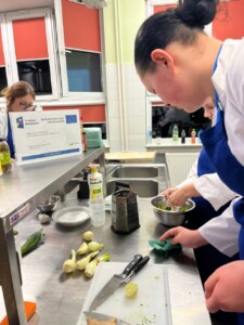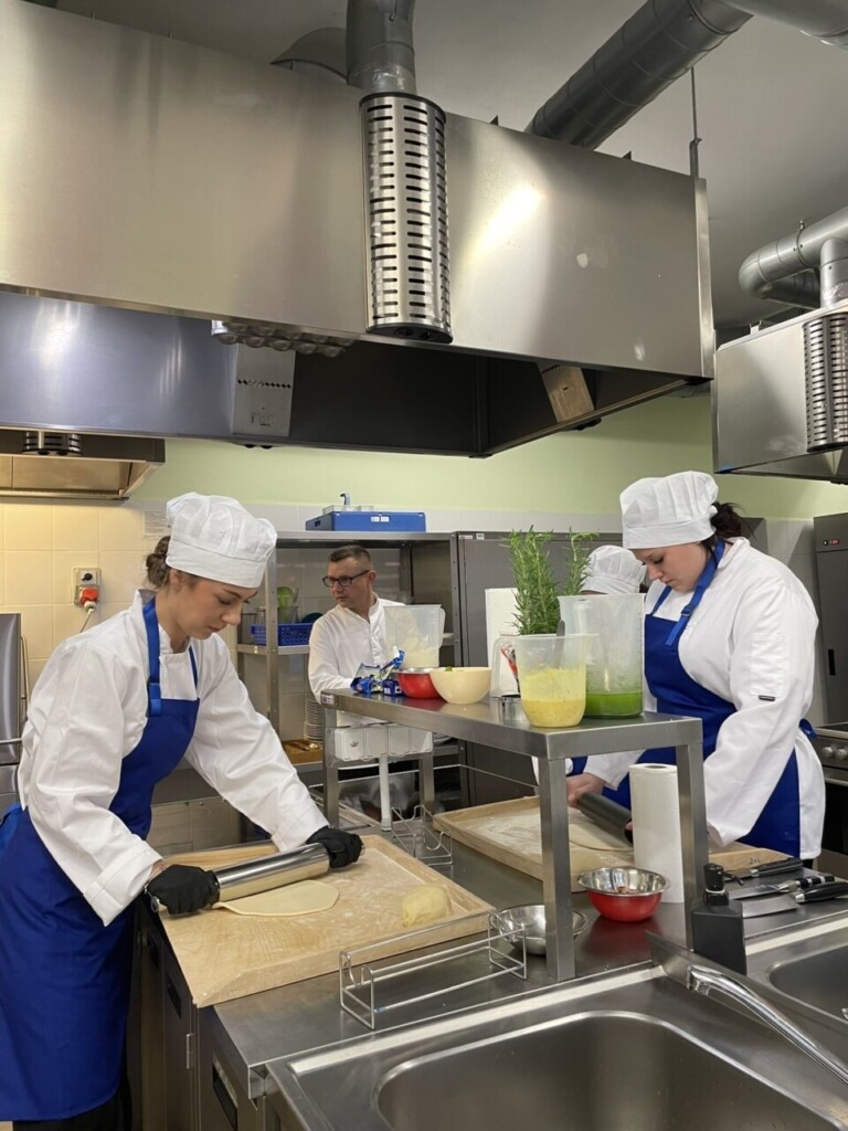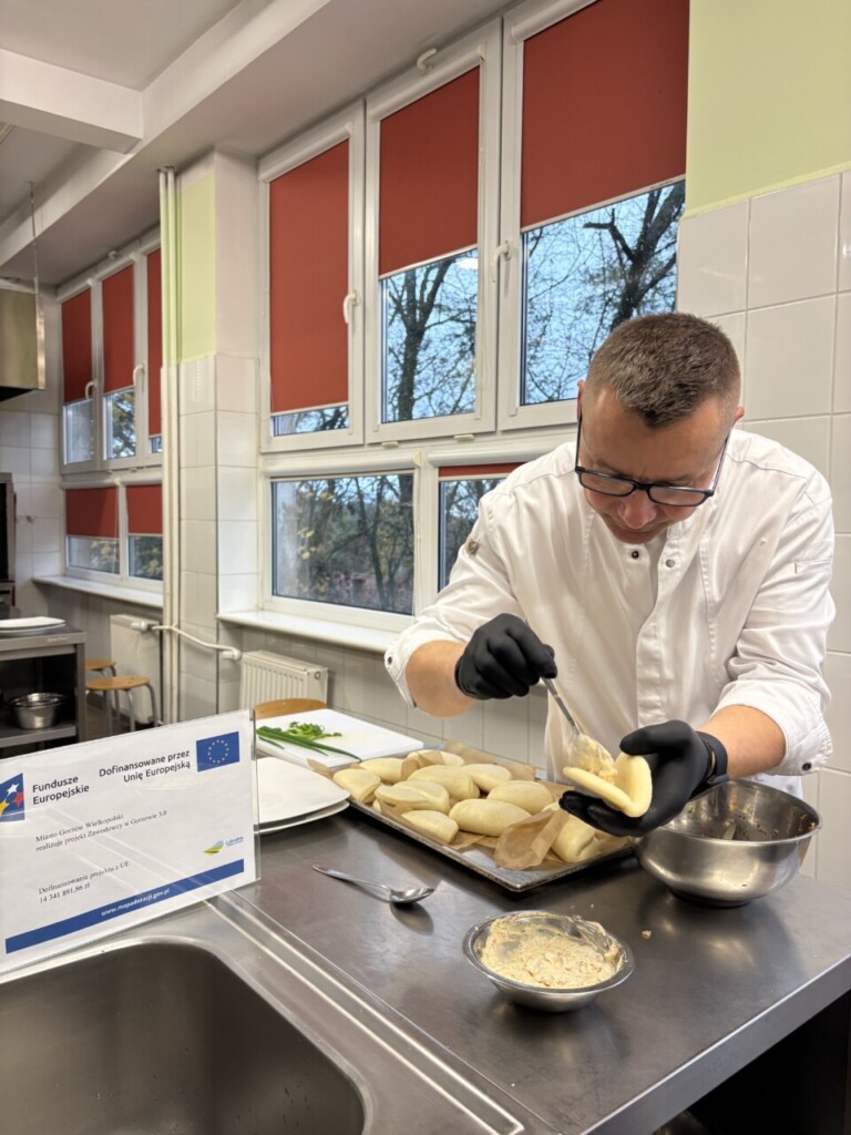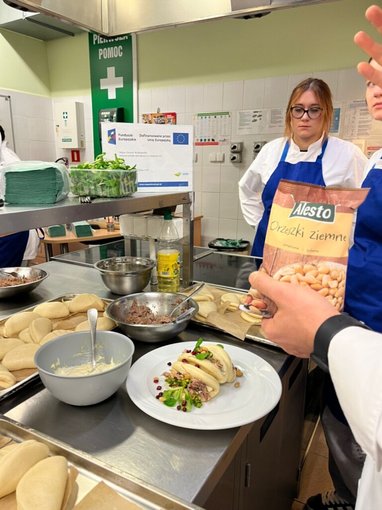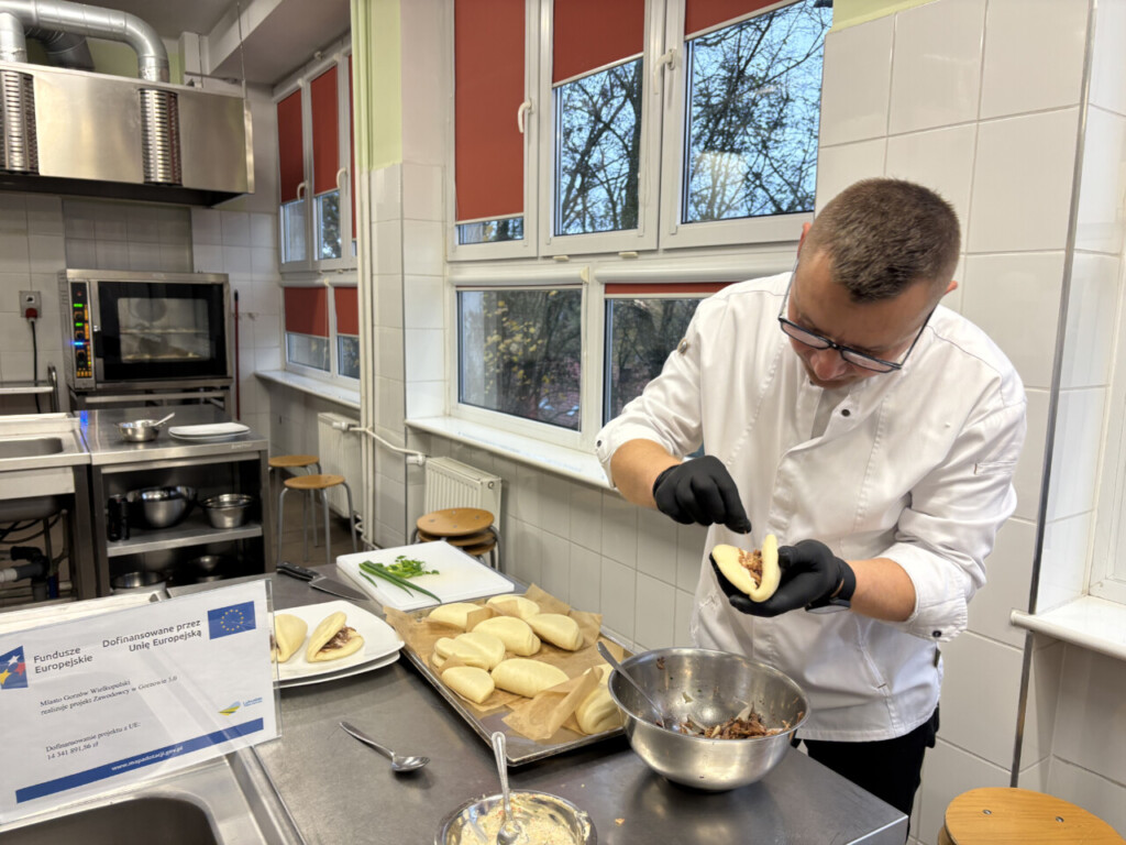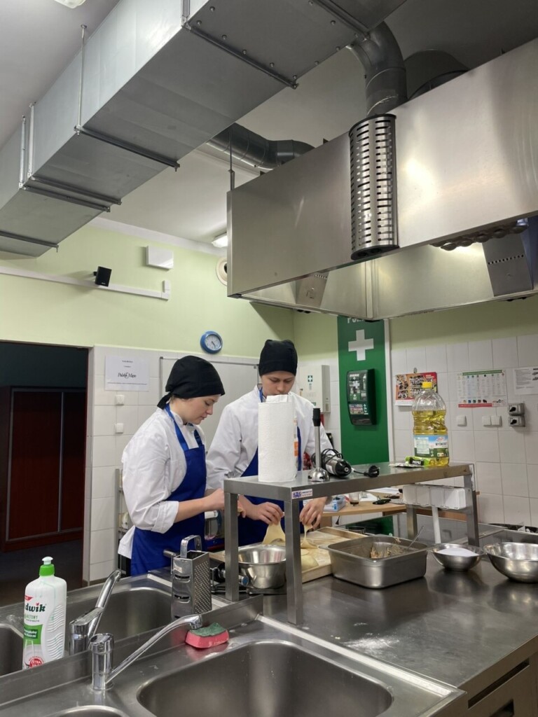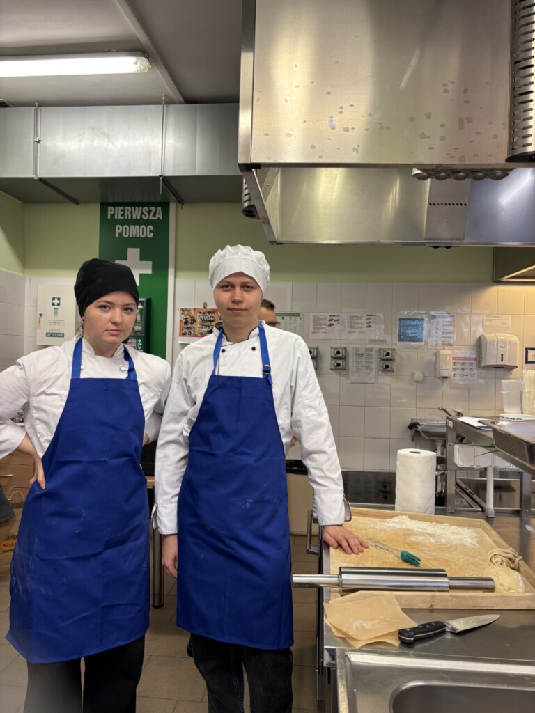 Podczas warsztatów kulinarnych uczestnicy zakwalifikowani do udziału w spotkaniach prowadzonych przez pana Michała Rejniaka – szefa kuchni i nauczyciela przedmiotów zawodowych, zmierzyli się z wymagającą tematyką pod hasłem „Kuchnie różnych narodów”.