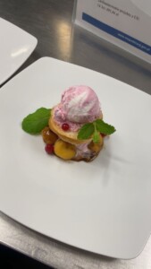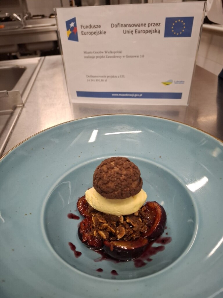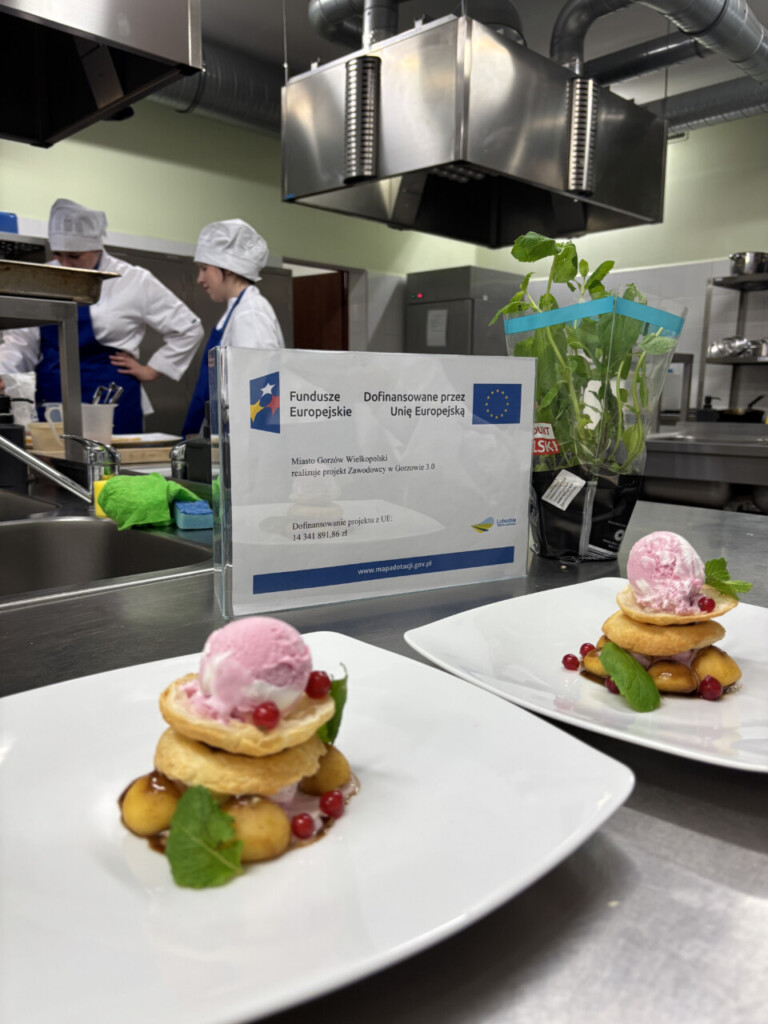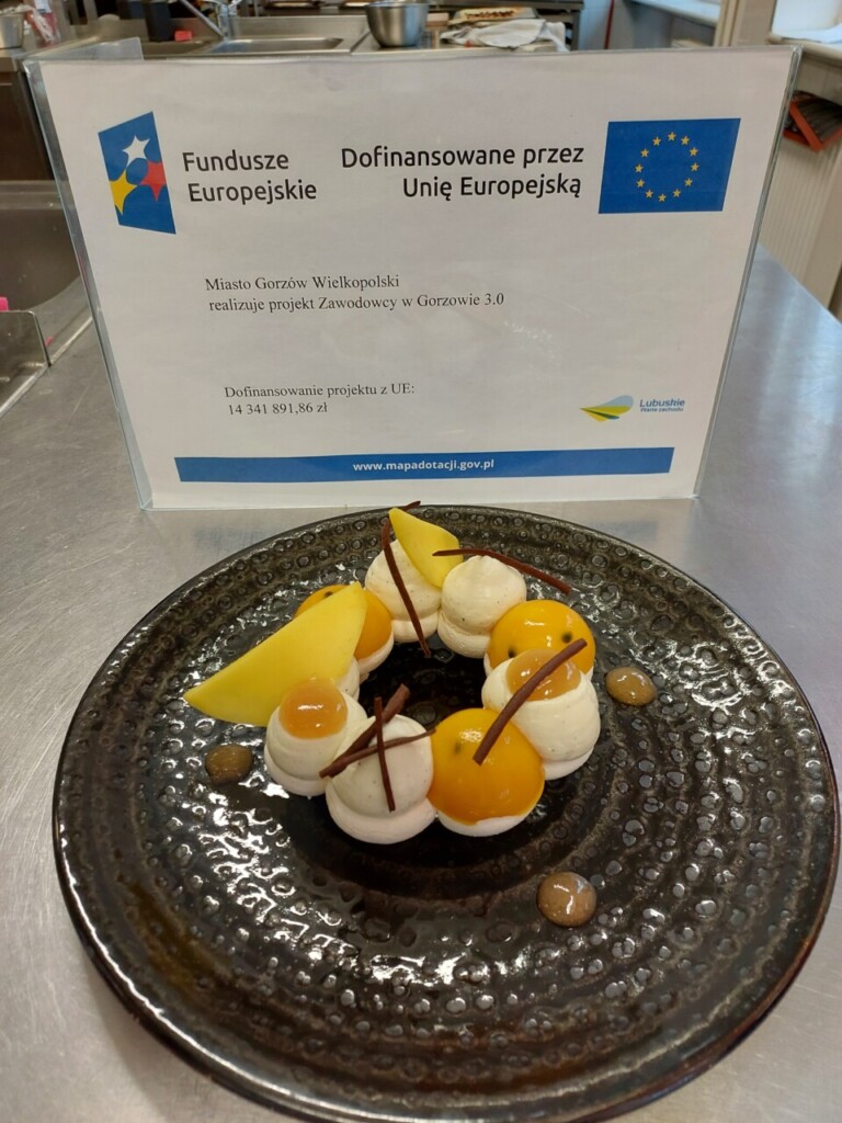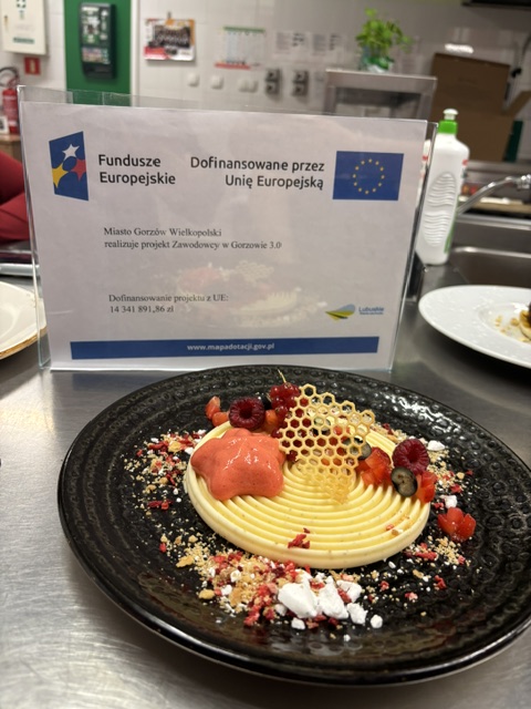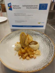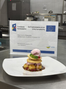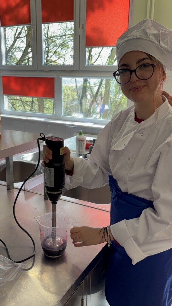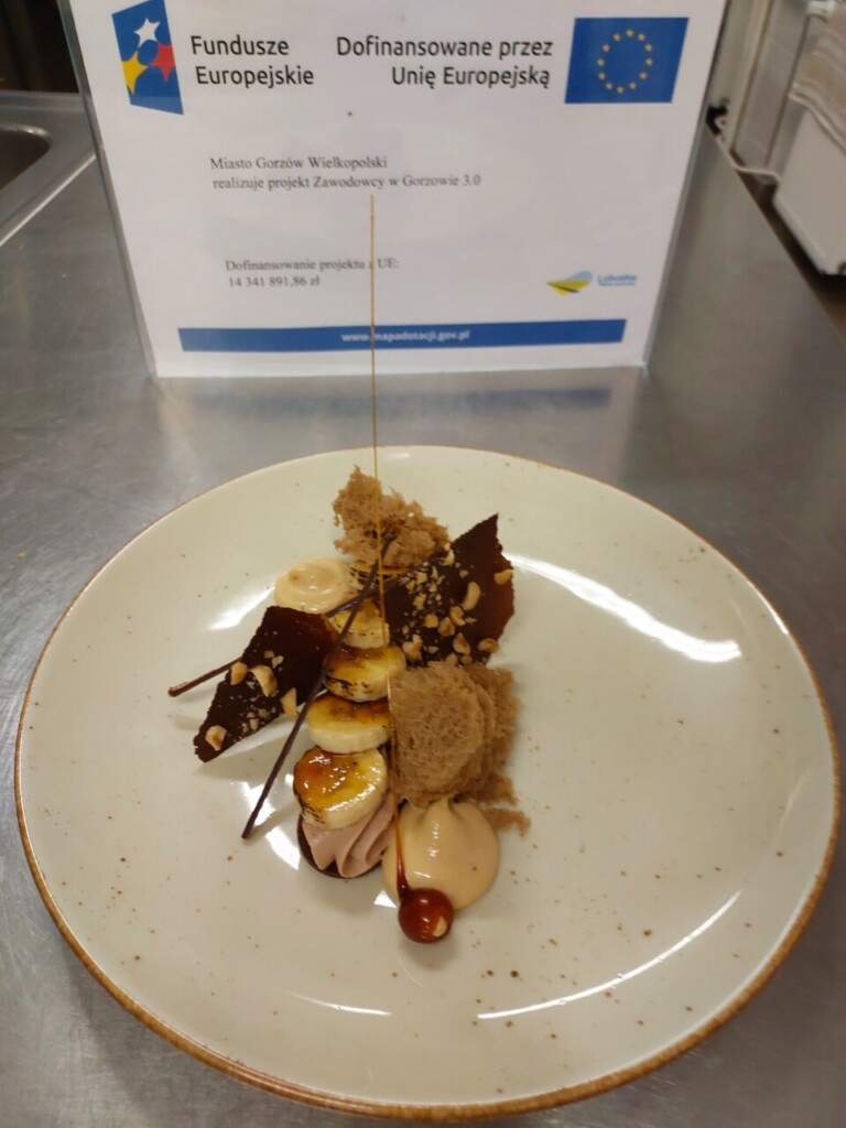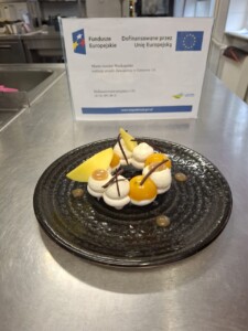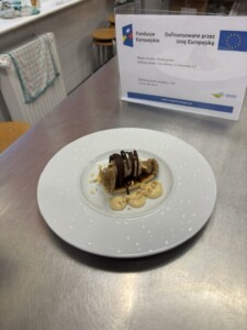 Przygotowanie sosu angielskiego jako bazy do innych deserów, bądź samodzielnego  dodatku  nie stanowi już dla naszych uczniów żadnego problemu, jak i wykorzystanie syfonu do ciasta biszkoptowego („odpiekanego” w mikrofali) – element dekoracyjny – gąbka.