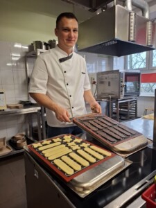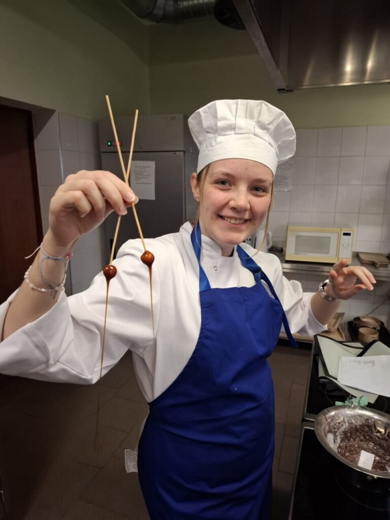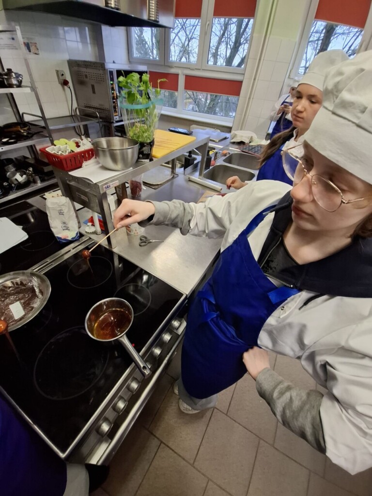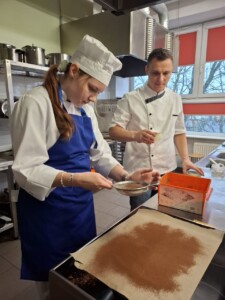 Podczas warsztatów uczniowie poznali również arkana przygotowania praliny orzechowej – pistacja i niezwykle atrakcyjną tematykę wykorzystania czekolady ( z omówieniem metod temperowania) i karmelu jako elementów dekoracyjnych.